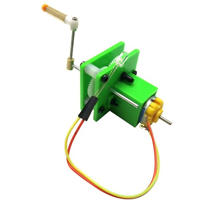 Al girar la manivela, el movimiento mecánico activa un sistema de engranajes y un motor generador, produciendo corriente eléctrica capaz de encender un LED o alimentar pequeños circuitos.
